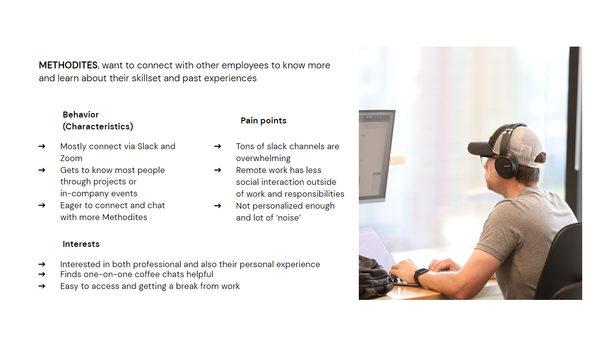 The concept: Using the database, Methodites can search for the employees that share the same interests (pets, TV shows, nature) or topics they are interested in learning about (ex. python, illustrations, etc.) and reach out to them to establish new connections. When they click Connect, the automated message populates in Slack. It can be modified for a personal touch. After meeting someone new, you have an option to exchange the cards and add them to your collection.